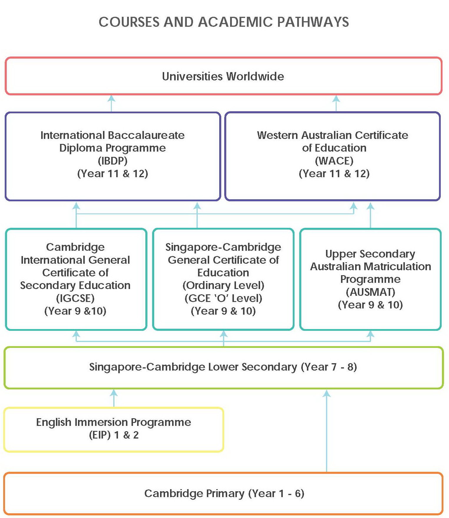 เปิดสอนการเรียนระบบสิงคโปร์เเคมบริดจ์ Primary, Singapore Cambridge O’Level, IGCSE , ระบบออสเตรเลีย AUSMAT และ อื่นๆ โรงเรียนมีความเชี่ยวชาญด้านการสอนภาษาอังกฤษสำหรับนักเรียนต่างชาติเพื่อช่วยในการปรับตัวให้เข้ากับการเรียนหลักสูตรภาษาอังกฤษในโรงเรียนและการเรียนในระดับที่สูงขึ้นไปในอนาคต โรงเรียนมีความยินดีต้อนรับนักเรียนต่างชาติเพื่อเสริมสร้างชุมชนของโรงเรียนของเราให้มีความหลากหลาย ให้มีความคิดสร้างสรรค์จินตนาการ สร้างสรรค์นวัตกรรม และส่งเสริมการเป็นผู้ประกอบการให้เเก่นักเรียนของเรา