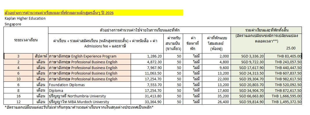 ·        ค่าใช้จ่ายส่วนตัวสัปดาห์ละ SGD 150 - SGD 200 ขึ้นอยู่กับแต่ละบุคคล